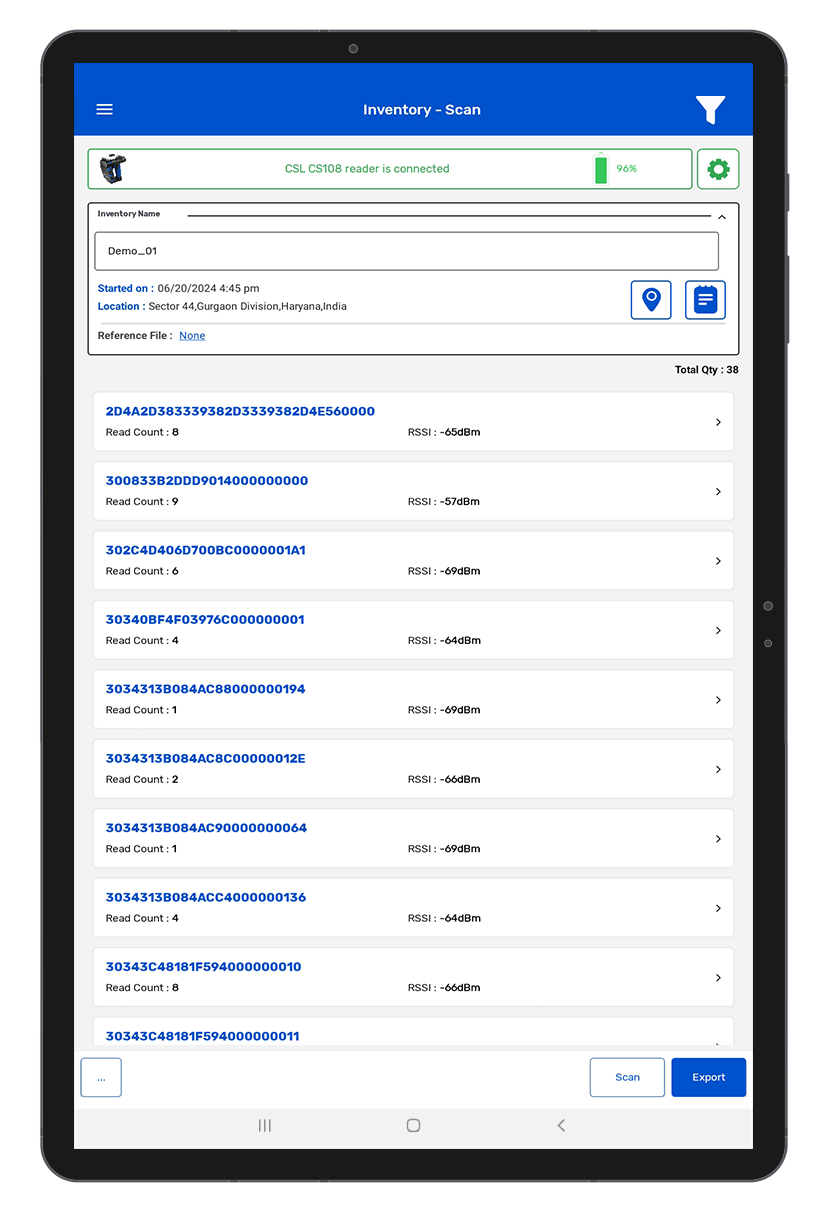 4) Depending on the RFID device that you are using, you can either use the physical button / trigger on the RFID device or Start / Stop button on the screen. As shown in Fig 0.5.