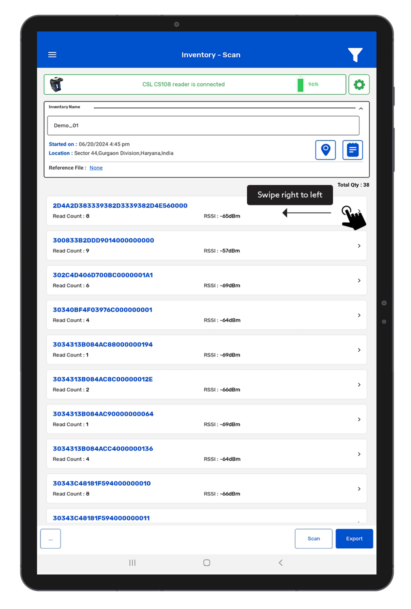 1) On the Inventory Scan page, swipe right to left on the desired RFID tag. As shown in Fig 0.2.