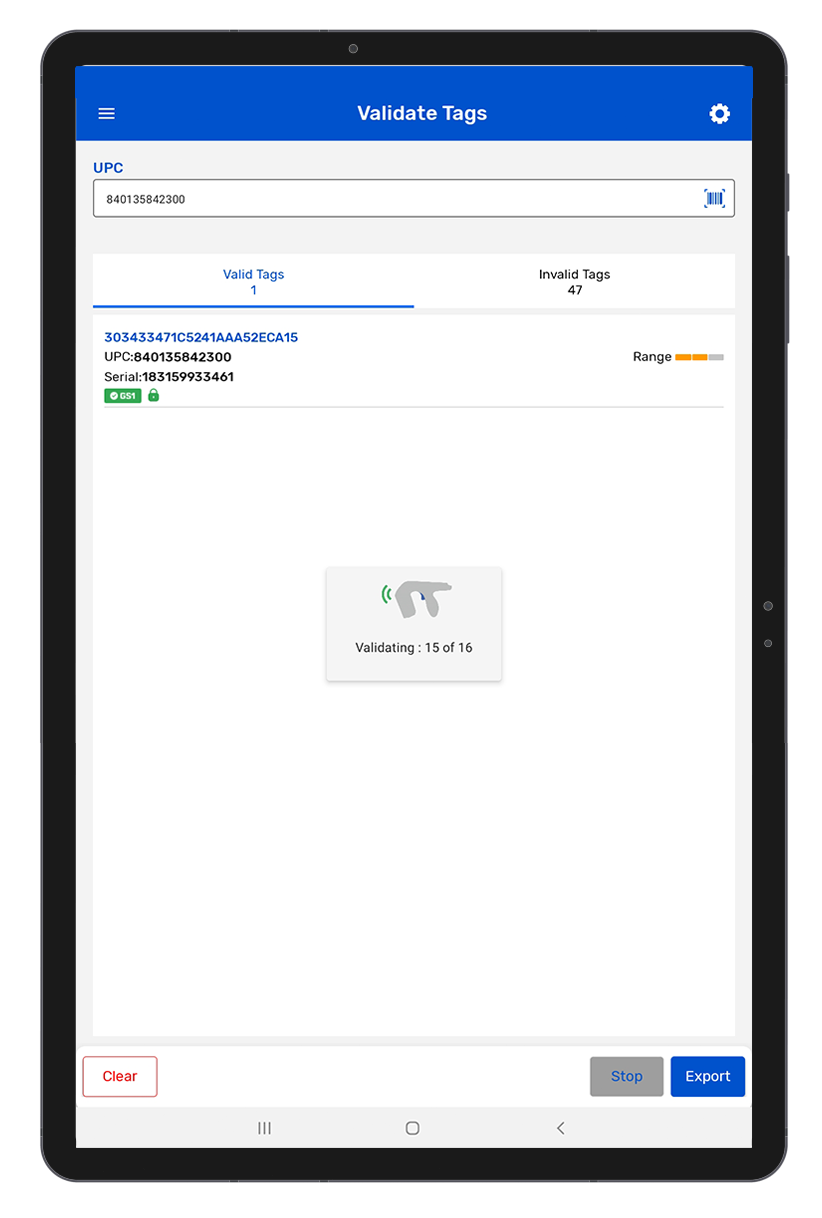 • As RFID tags start to be collected, they will be displayed on the validate tag module with details such as the EPC, UPC, Range, Serial, GS1 Tag and Lock Status.