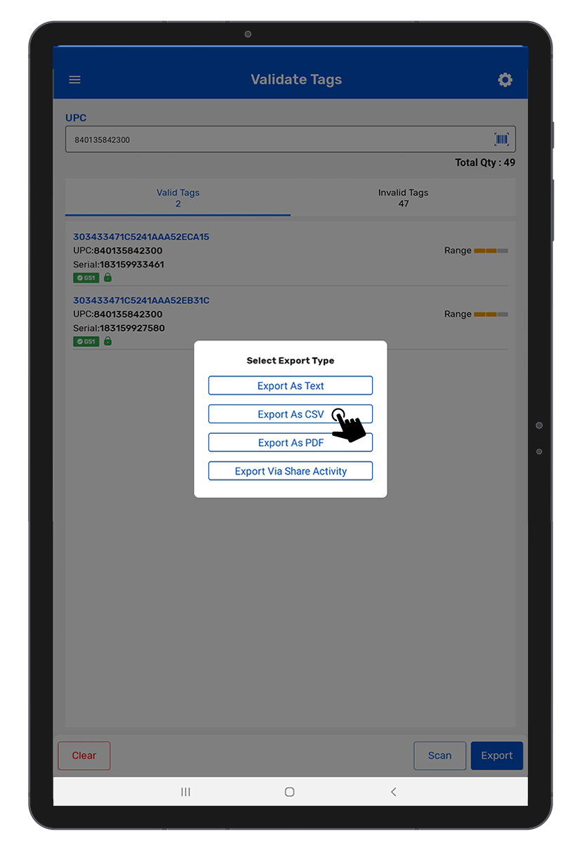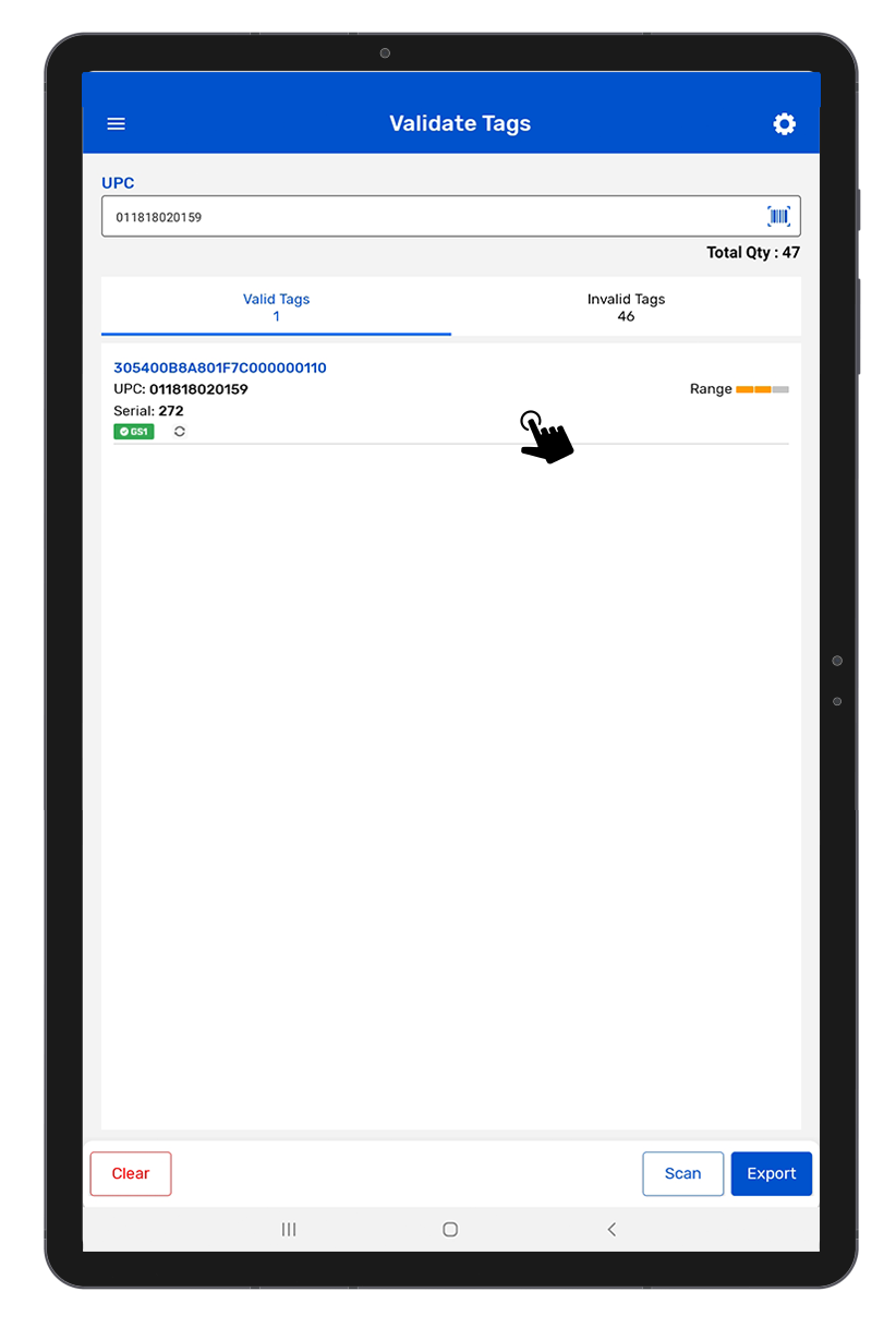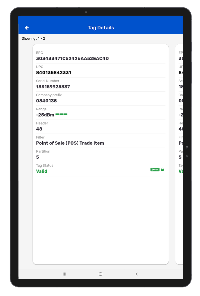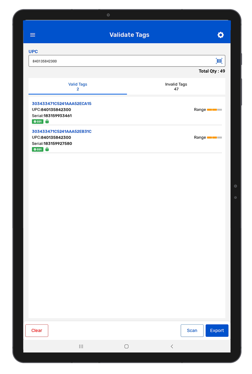 • While scanning, we fetch the GS1 and Lock status and based on the result we display on respective tabs (Valid Tags/Invalid Tags) after stopping the scanning.