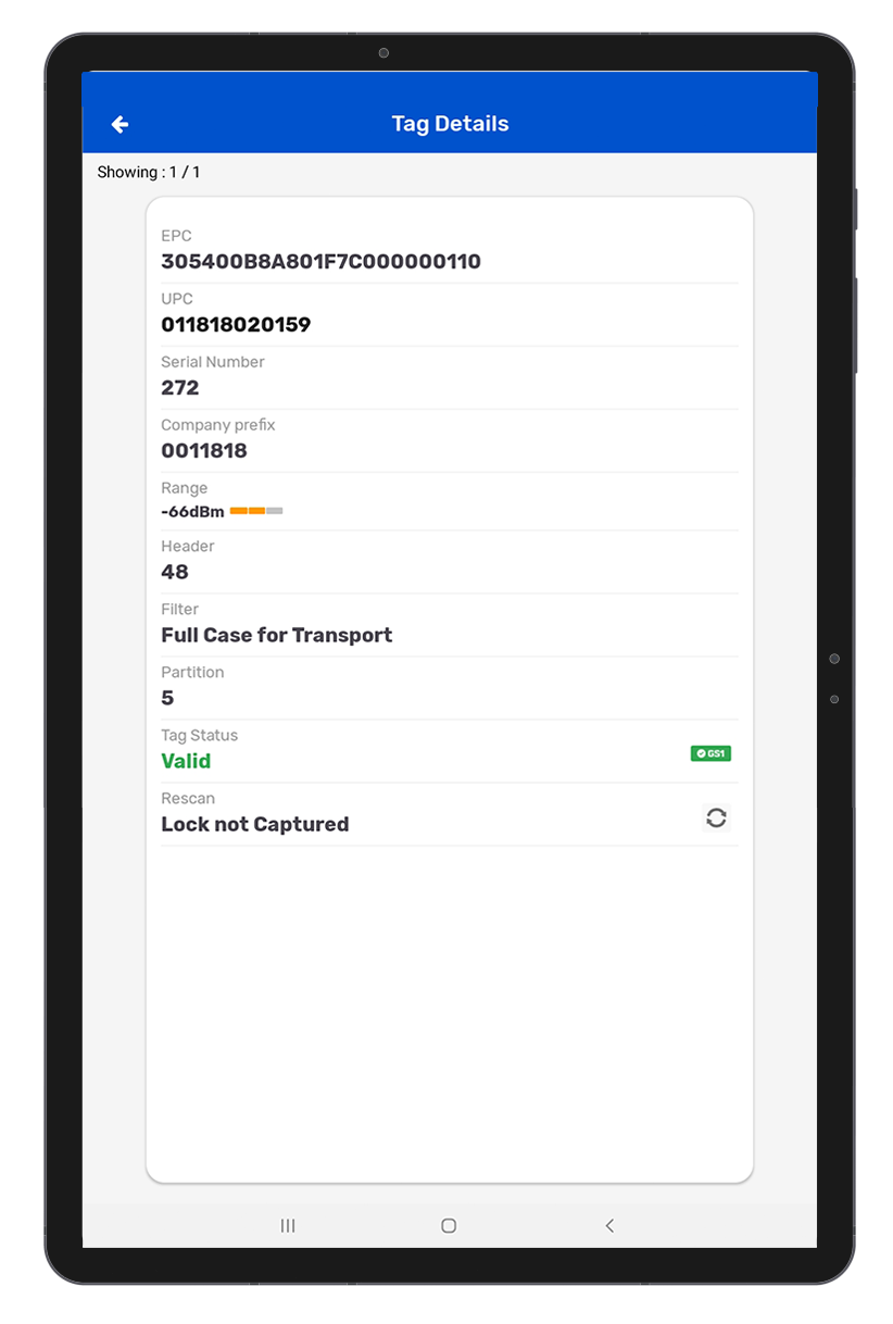 - GS1 standard: The tag should be in validated SGTIN format.