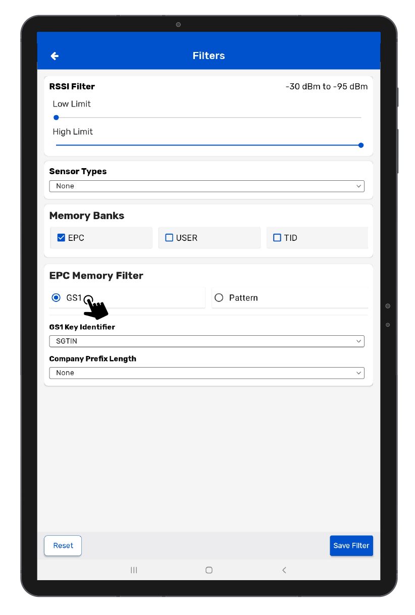Example: If the Prefix filter is selected and the value AB is entered, only tags that have EPCs that start with AB will be captured.