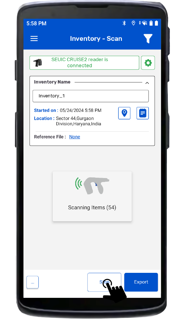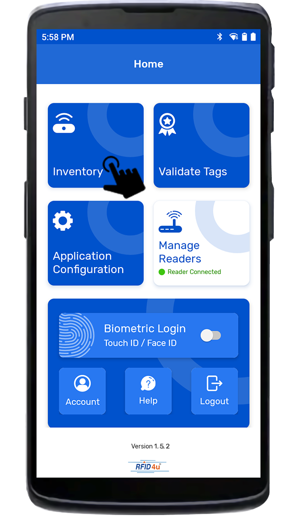 1. To read the RFID tags from the Seuic AUTOID UTouch2 reader; Click on the “Inventory” button option from the Home page of TagMatiks Wedge Application. As shown in Fig 0.3.