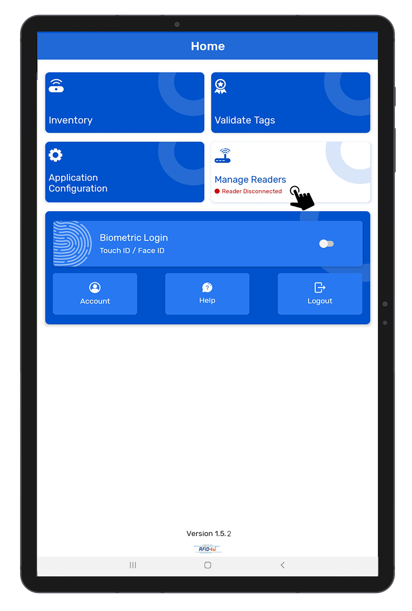 3. As no RFID reader is paired with this Android device; thus, the status is showing as:“Reader Disconnected”. as shown below (Fig 0.3).