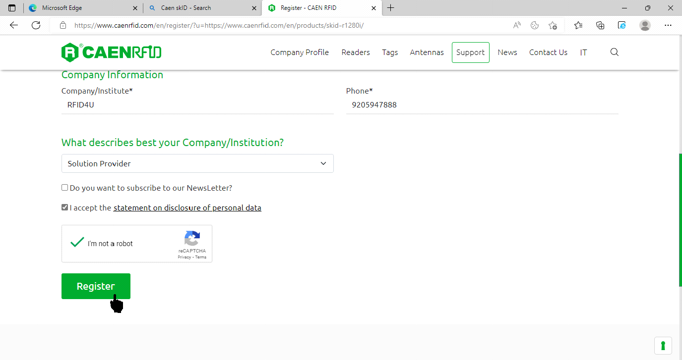 6. If you are new to the CAEN website fill out the registration form and click on the “Register” button as illustrated in the picture below: