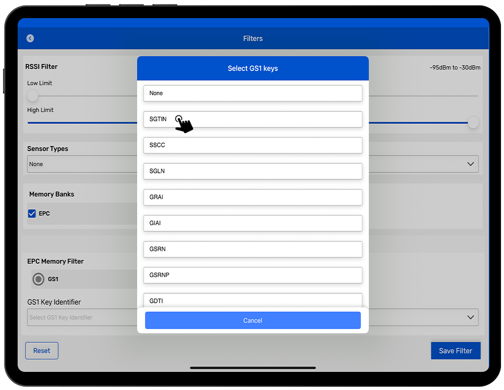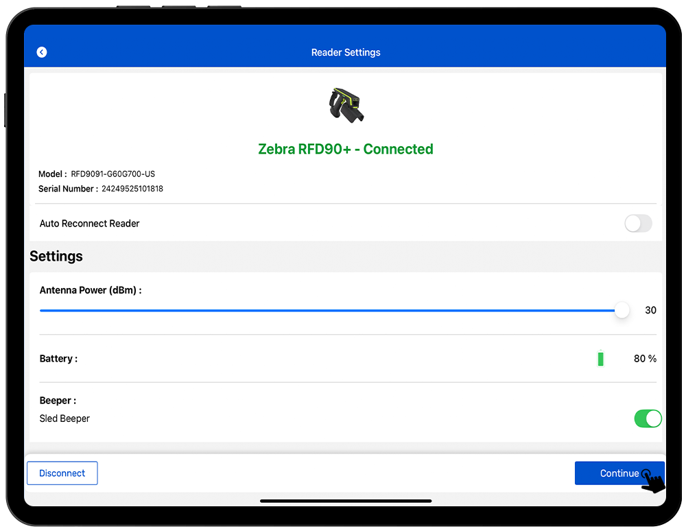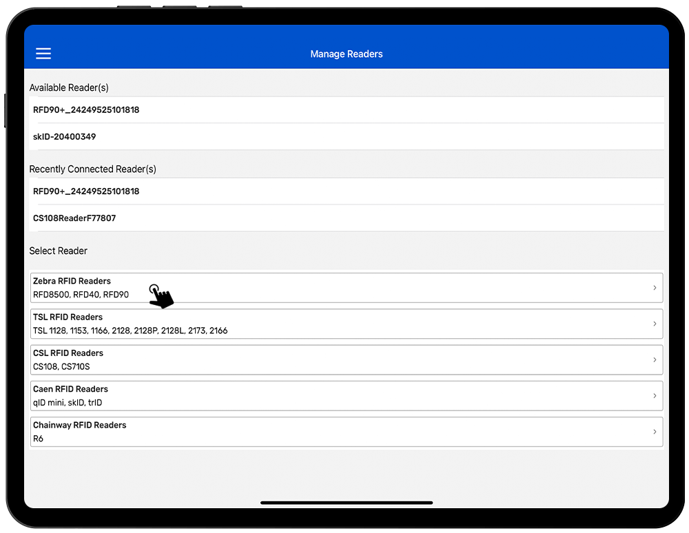 7. Click on RFD90 and bring the RFD90 reader close to the iOS device.