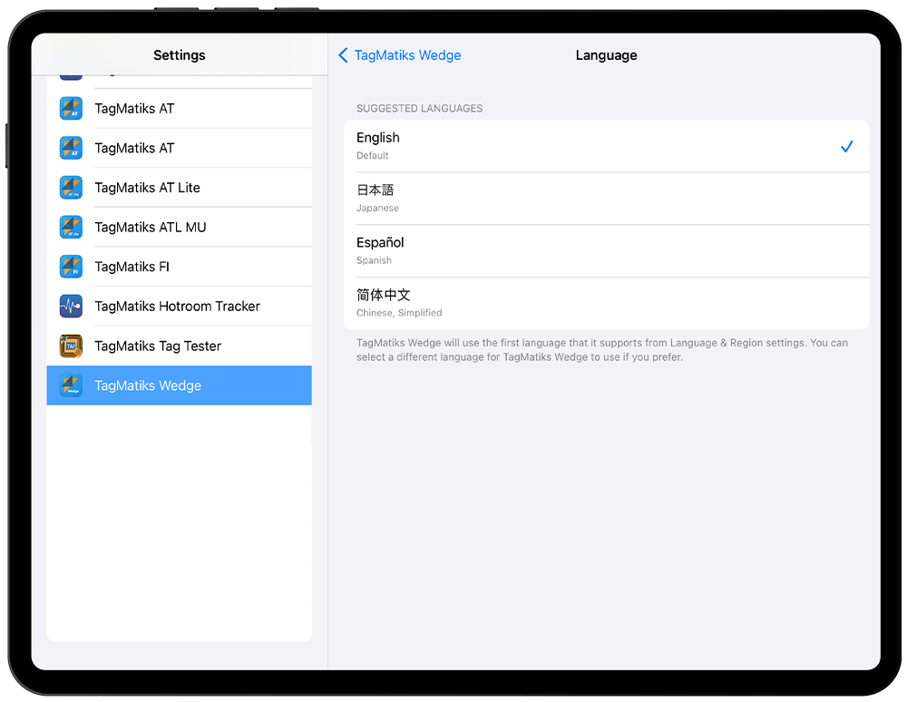 TagMatiks Wedge automatically changes to the supported languages above if the target device is set to that language. To update your language for your iOS device.