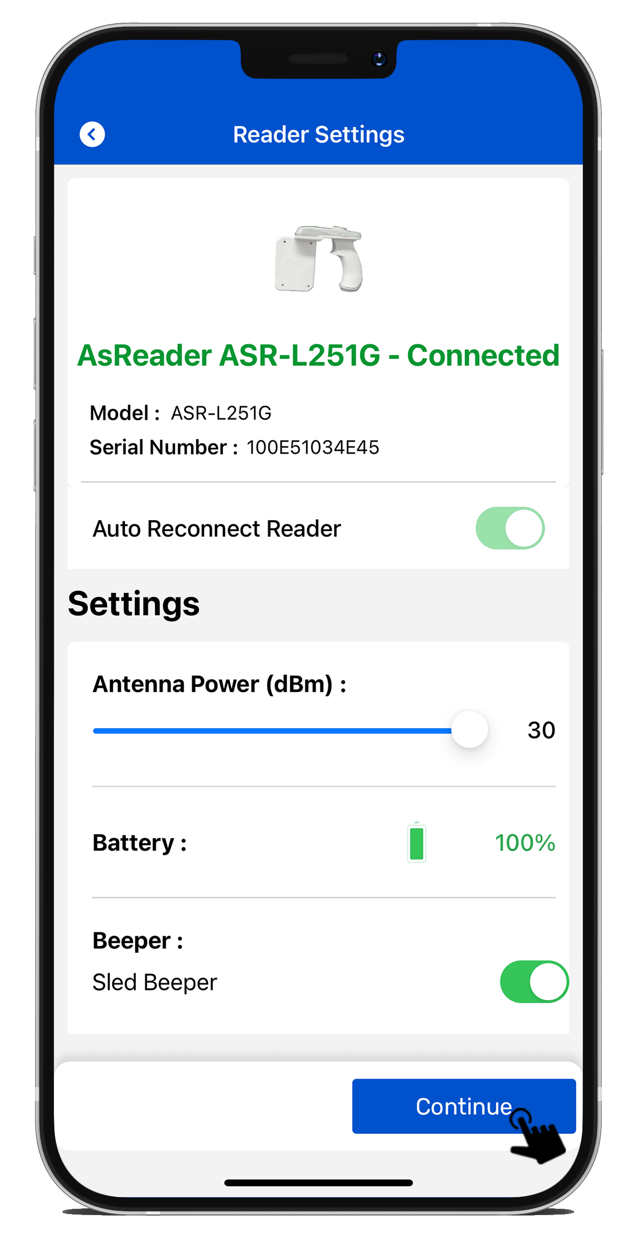 • Once the ASR-L251G is connected, the application will show the Reader information on the Reader Settings Page.As shown in Fig 0.3.