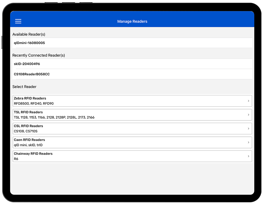 • Open TagMatiks Wedge and select Manage Readers by tapping on the upper left corner of the screen.