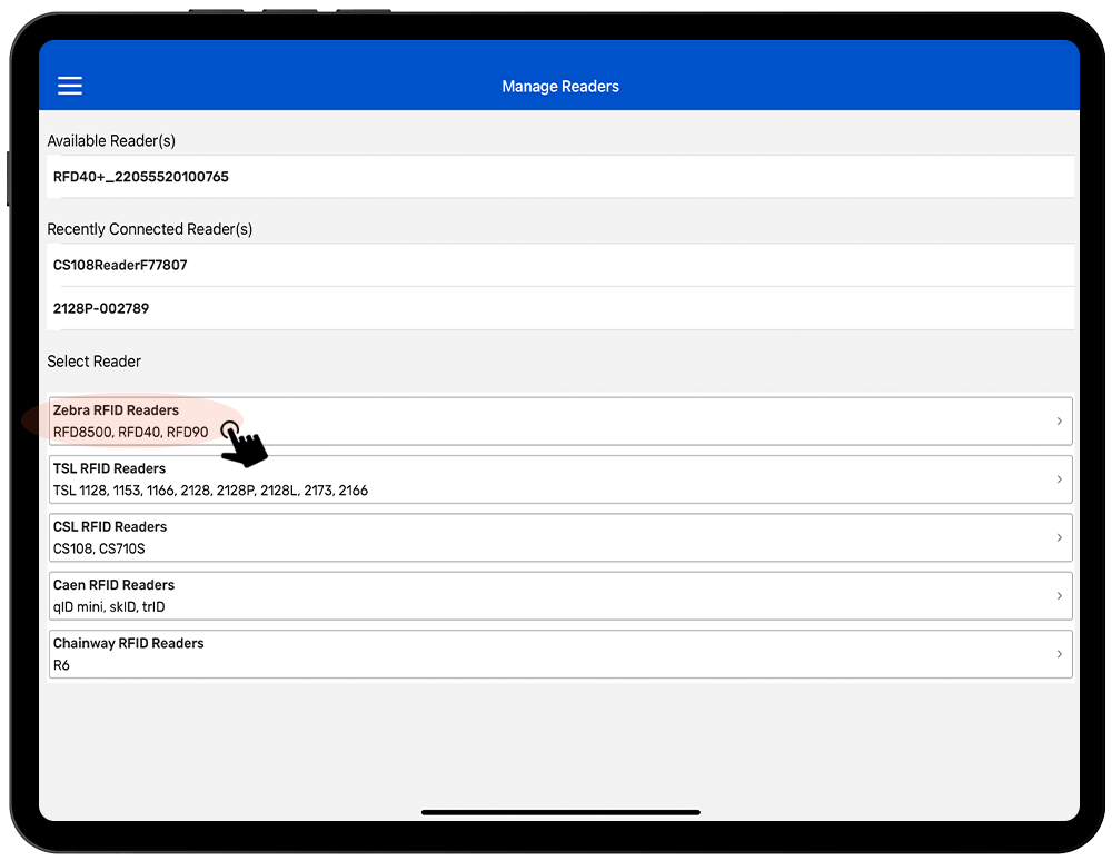 This section contains setup information for using the Zebra RFD40 sled RFID readers with TagMatiks Wedge.